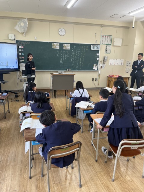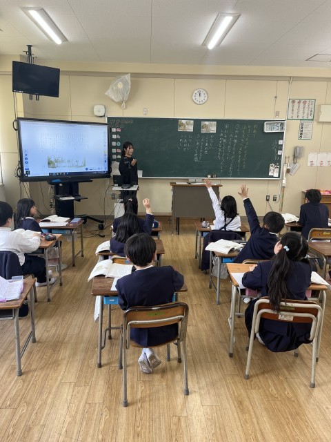 4時間目、2年2組は国語科「手紙」の4場面の学習でした。学習場面を全員で声を合わせて読んだ後、グループでも音読に取り組み、とても楽しそうに本を読んでいました。その後、がまくんとかえるくんの気持ちの変化を読み取っていました。手を挙げて自分の考えを発表することができました。
