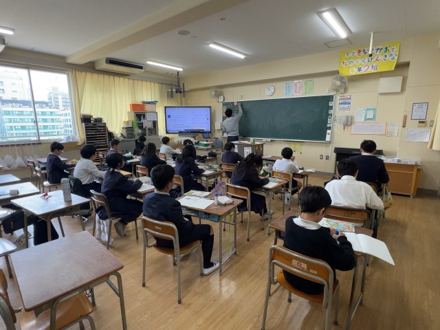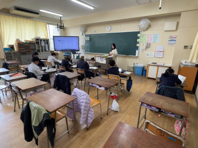 子どもたちは直方体の図形を見ながら、垂直な線はどれかな、平行な編はどれかなと言いながら、問題を解いていました。
