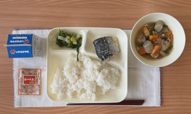 本日の献立は、ごはん、さごしの塩こうじだれかけ、さといもと野菜の含め煮、なのはなのおひたし(かつおぶし)、牛乳です。