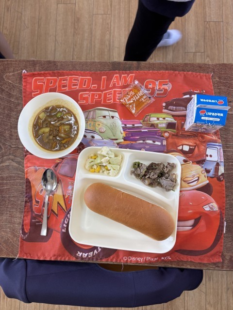 3月17日(火)本日の献立は、コッペパン、みかんジャム、豚肉の香味焼き、カレースープ、カリフラワーとコーンのサラダ、牛乳です。