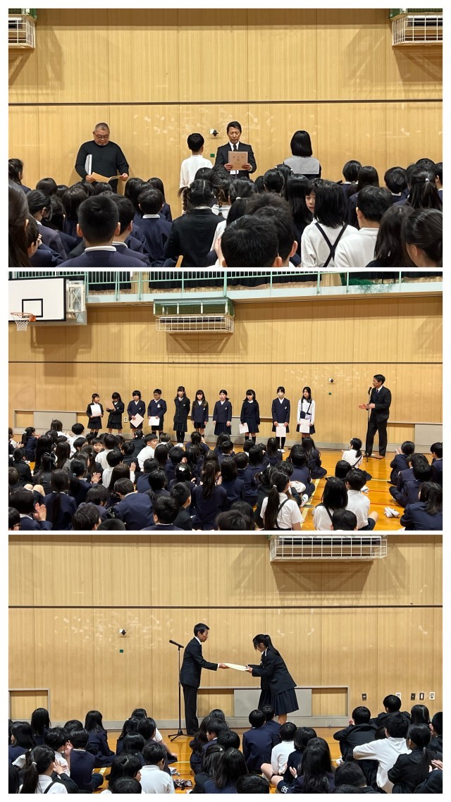 表彰では、「マナーとモラルの意識の高いまち にしなり」のマナーアップキャンペーンと、ソフトテニス部の表彰が行われました。みなさん、おめでとうございます。