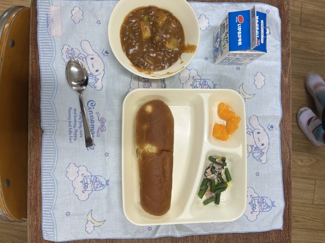 今日のこんだては、おさつパン、ビーフシチュー、ベーコンとさんどまめのソテー、みかんのかんづめ、牛乳です。給食は栄養バランスのよい食事になるように考えられています。また、給食を通してさまざまなことを考え、学ぶことができます。