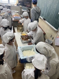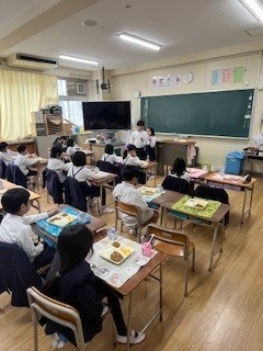 1年生のみなさん、ご入学おめでとうございます。今日の給食はみなさんが小学校になったお祝いの献立です。2年生以上の皆さんも1年生の入学と自分たちの進級を一緒にお祝いしましょう。3年生になり、給食当番もすっかりスムーズにできるようになりました。今日は子どもたちにとって大好きなカレーライスです。おいしそうにしっかり食べていました。