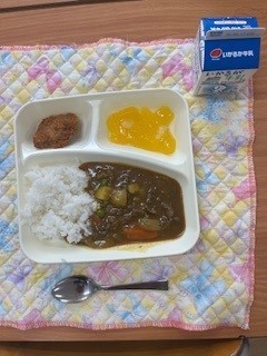 今日のこんだては、カツカレーライス(こめこカツ、カレー)、フルーツゼリー(わなしのかんづめ・みかんゼリー)、牛乳です。