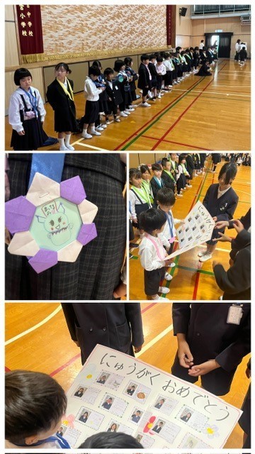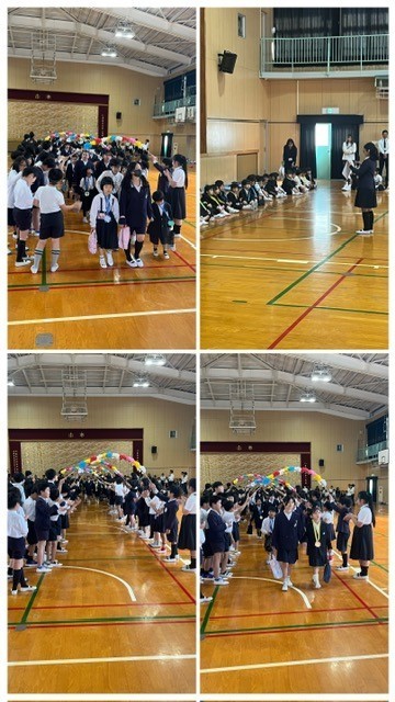 今日の一時間目、1年生を迎える会を行いました。1年生の教室まで6年生が迎えに行き、一緒に体育館に入場することができました。ちょっと緊張した面持ちでしたが、2~5年生にあたたかく迎えられ、うれしそうな笑顔がたくさん見られました。運営委員会の代表児童の挨拶に始まり、全児童でじゃんけん列車をして遊びました。その後、2年生からはメダルのプレゼントと6年生からはメッセージボードのプレゼントがありました。最後に校歌を全児童で元気いっぱいに歌いました。運営委員会の皆さんの頑張りと、2~6年生のあたたかいメッセージを校長先生がたくさんほめてくれていました。