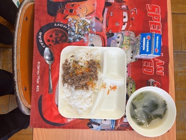 今日の献立は、ビビンバ(肉・野菜)、トック、いもけんぴフィッシュ、牛乳です。