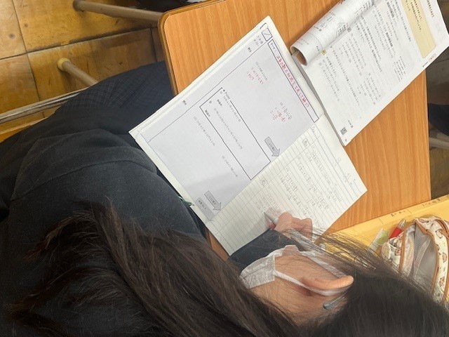 1時間目、7年生は数学の学習に取り組んでいました。「正負の加法を工夫して解こう」というめあてのもと、分数の計算に取り組んでいました。生徒の皆さんは解答に+や-を付けることを忘れないように取り組み、自分の解答の手順がわかるノートを上手に作っていました。