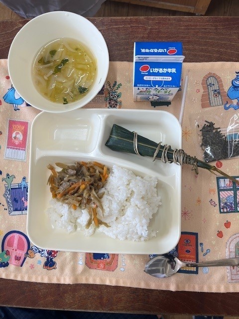 今日の献立は、きんぴらちらし(きざみのり)、五目汁、ちまき、、牛乳です。