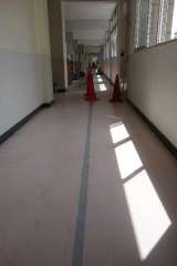 写真は職員室近くの廊下を写したものです。床の色が右と左で大きく違います。 左...