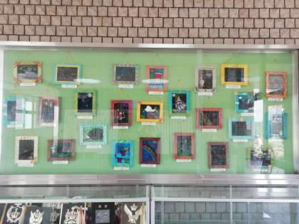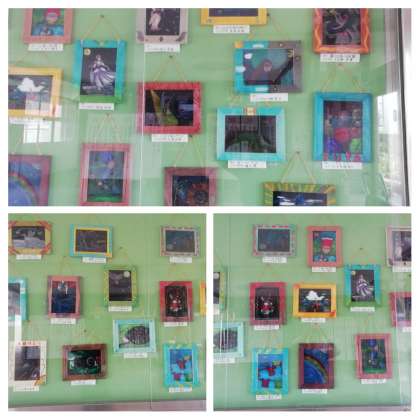 1年時に制作したスクラッチグラスと木彫額を玄関ホールに展示しました。