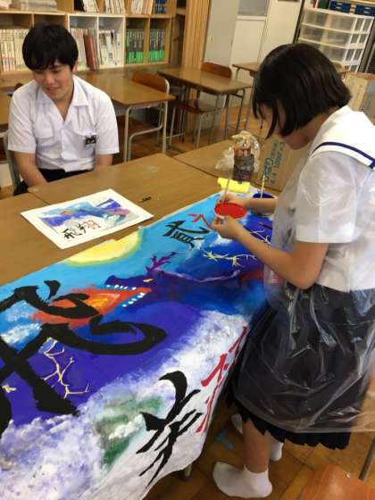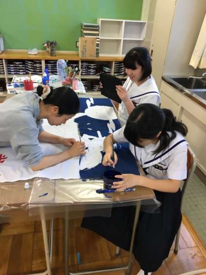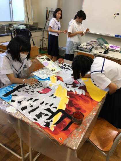 そして、校外学習から帰って来たあとは、美術室で学級旗作成に取りかかりました。
