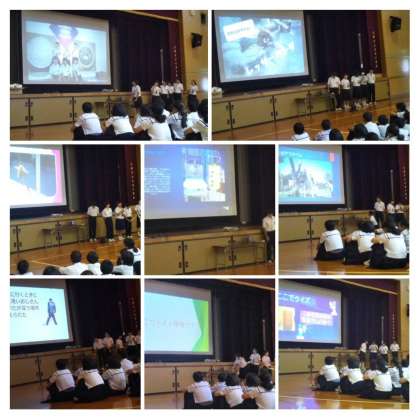 そして本日6月19日(水)の6時間目に体育館で、全クラスの前でプレゼン大会が行われました。今日の日のために、慣れないタブレットに四苦八苦しつつ、班のメンバーと知恵を出し合って発表準備をしてきました。発表本番では、緊張しながらも、どの班も創意工夫を尽くした発表をしてくれ、学びの多い郊外学習だったんだなと思えるものでした。パワーポイントの作り方&使い方をマスターできたことは、きっと将来に役立つと思います。