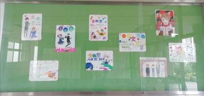玄関掲示板には、美術部が作製したポスターを飾っています。