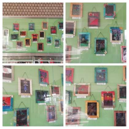 玄関展示ケースに2年生が、1年時に作った作品を展示しました。