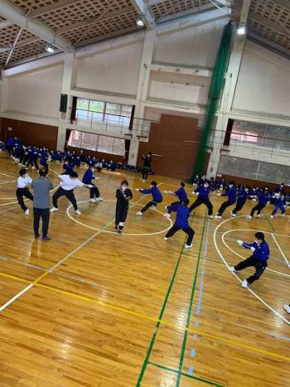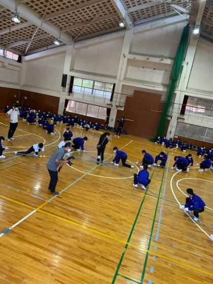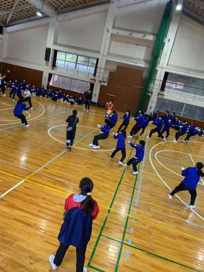 クラス対抗綱引き大会。4方向に同時に引っ張り合いました。4クラスとも全力で頑張っていました。なぜか、靴が飛ぶというアクシデントもありました。