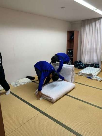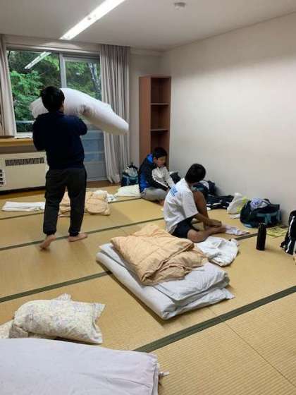 寝具の片付けや水筒を洗うなど、朝から活動しています。