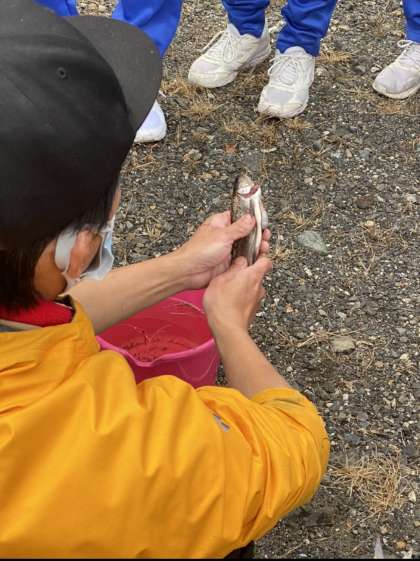 釣りもまずは、釣れた後の虹鱒の下処理の仕方を教わります。みんな真剣に話を聞いていました!日々の授業もこれぐらい積極的に聴けると良いですね!?