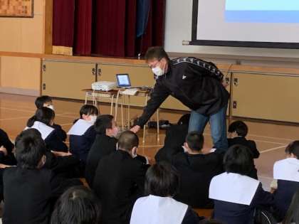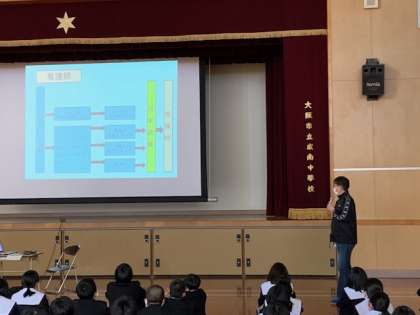 進路主事の清水先生から進路についてお話を聞きました。インタビューでなりたい仕事を聞かれたときには、プロ野球選手、美容師、鉄道関係整備士、警察官などが挙がっていました。福祉ボランティア科、芸能文化科、エンパワーメント科など大阪府独自の学科名の説明もありました。なりたい仕事につく道筋、私立と公立の違い、高校受験の仕組みについても解説され、自分に向いていることを考えることの大切さが示されました。