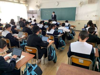 クラスに戻ってからは、担任の先生からお話されたり、1人1台生徒用端末のPCで自分の興味合わせて調べ学習に取り組んだりしました。