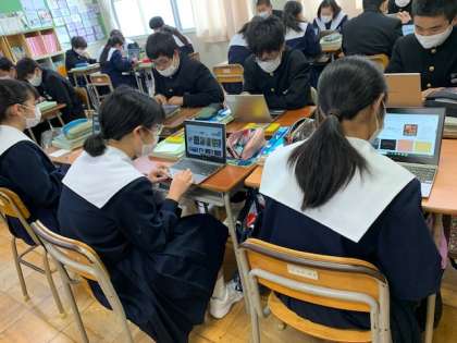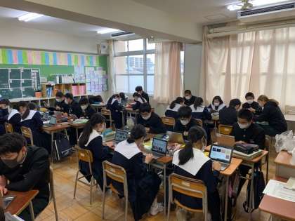 各自の新しいコンピュータで英語の言葉、名言などを調べています。ブロックが多かったり速度が遅いなど問題がありますが、いろいろ工夫しながら一生懸命調べてます。