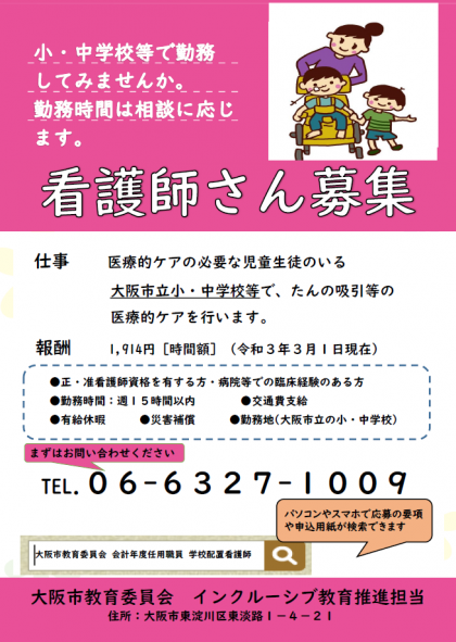 大阪市の小学校や中学校には、たんの吸引や胃ろう、導尿等、医療的ケアを必要とする子どもたちが多く学んでおり、安心・安全な学校生活を送るためには、看護師さんのサポートが必要です。