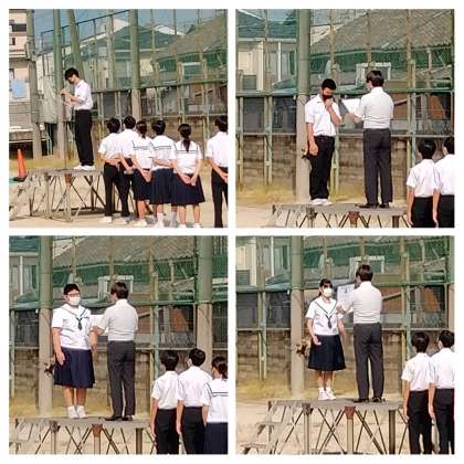 まず校長先生から、新型コロナウイルス感染予防に関わって、今がこれまででも一番中学生の感染者が増えており、これまで以上に予防を徹底してほしいということ、パラリンピックについて、防災週間と880万人訓練について話がありました。