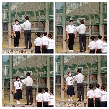 その後、選挙管理委員会から後期生徒会役員選挙の公示があり、最後に夏休み中の部活動の表彰を行いました。