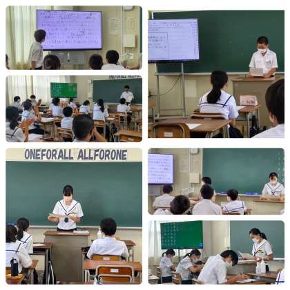 9月8日(水)2年生では夏休みの課題であった沖縄戦に関する調べ学習のまとめとして、発表を行いました。実際に沖縄戦を経験された方の証言動画などから学んだ、戦争被害の大きさや悲惨さを発表していました。平和のために自分たちに何ができるかを考える機会にしてくれたと思います。