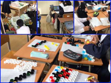 パソコンを使って調べ学習をする生徒、ペットボトルのキャップを色ごとに仕分けする生徒、下絵を作成する生徒、ペットボトルのキャップを貼り付けていく生徒など各クラスとも工夫を凝らしながら作品作りに取り組んでいます。