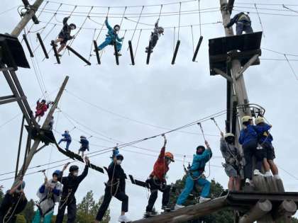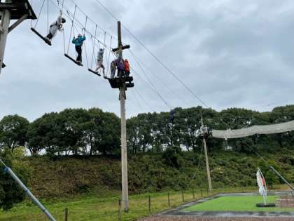 雨の中アスレチックに挑戦しています。