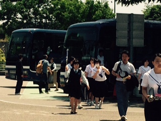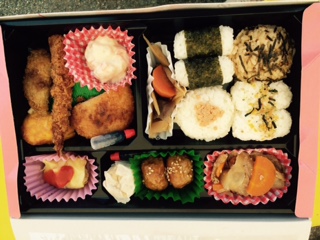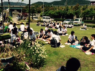 お弁当を受け取って、芝生の上で食べました。男子や女子に「エビフライいる?」とあちこちで声をかけられ8本も食べた女子がいました。とっても良い天気です。5月20日11:30