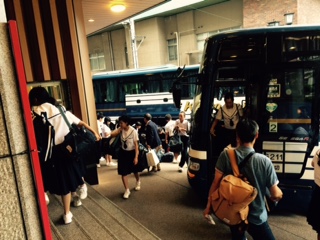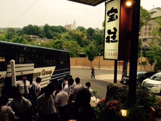 有名な道後温泉本館を横目に見て坂を上がったところに今日の宿舎の「宝荘ホテル」があります。無事全員到着しました。「お世話になります」とご挨拶。