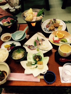ホテル到着後、お風呂に入って、さあ夕食です。