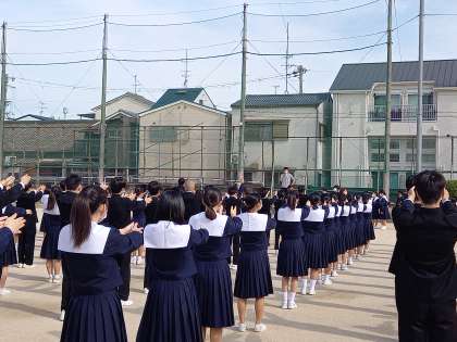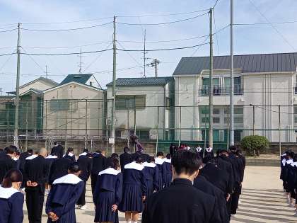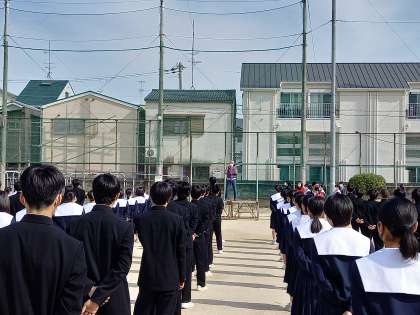 4月18日(月)。暖かい日差しの中、全校集会を行いました。