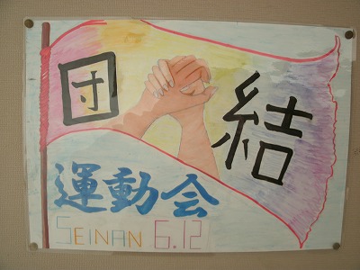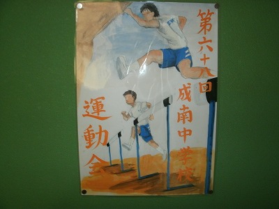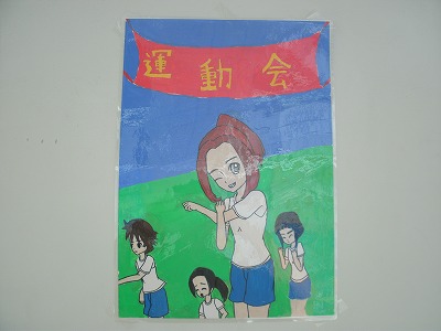 写真は、校舎の廊下や階段の掲示板に、掲示されている美術部が作成したポスターです。どのポスターも力作です。運動会の雰囲気を、いっそう高めてくれています。