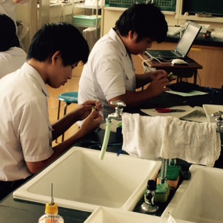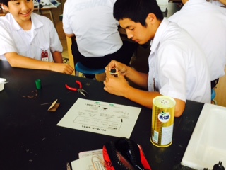 住吉高校から先生が来られて、クリップ、導線、単三電池、磁石だけで、モーターを作りました。どうやったら早く回るモーターが作れるのかに挑戦しました。難しいなか、とっても早いスピードで回るモーターが幾つかできて、「うわー めっちゃ回ってるやん」と褒めあっていました。