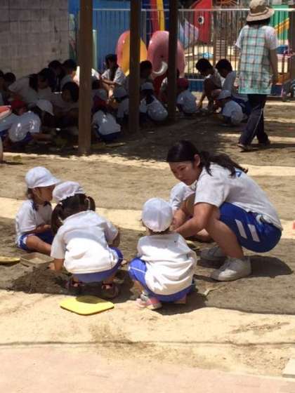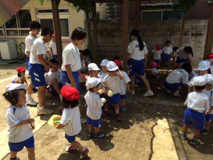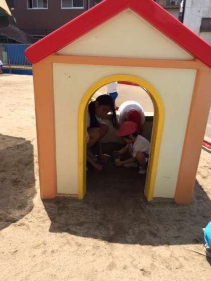 今日は3歳児のみなさんがお外で活動です。日差しがちょっときついのか、日陰で一緒に遊んでいます。
