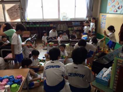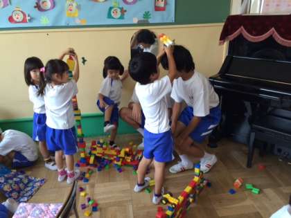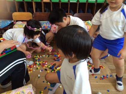 4歳児のみなさんはお部屋の中でブロック遊びです。どこまで高く詰めるかなあ〜。お兄ちゃんの頭にも積んじゃおう!