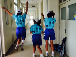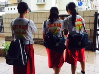 土曜授業が終わり、クラブを待ち構える生徒がたくさんいます。今日から学年カラーのTシャツを着ての練習にウキウキするソフトテニス部の1年生です。思わずジャンプ。バスケット部は練習試合に出発です。
