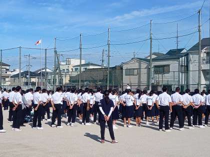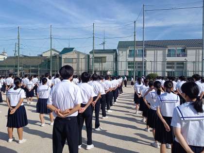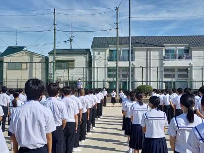 9月13日、夏を思わせる日差しの中、全校集会を持ちました。