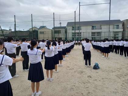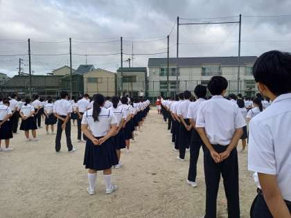9月20日、台風14号の影響がまだ少し残る曇り空の下、全校集会を持ちました。
