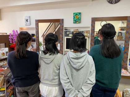 ヘアアレンジの練習をしている様子です。