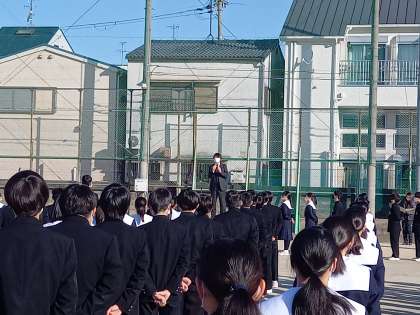 校長先生からは、昨日行われた大阪マラソンのことや、今週実施する1、2年生の学年末テストのこと、また、今週特別選抜の結果がわかり、一般選抜の出願もある、3年生の公立高校入試のことについて話がありました。