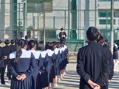 2月27日、きれいな青空の下、2月最後の全校集会を持ちました。