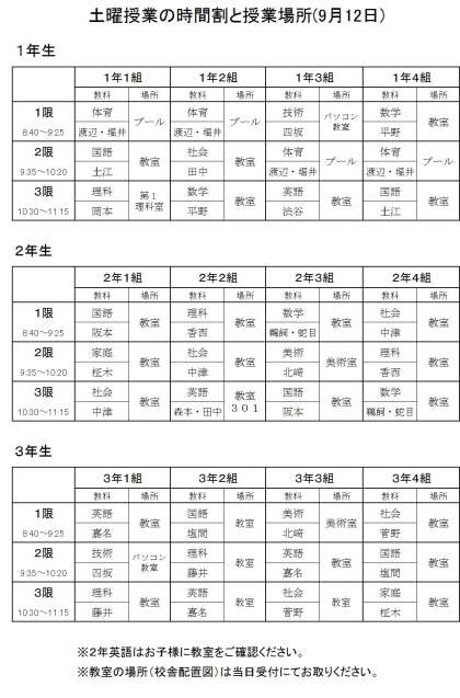 先日お知らせしました土曜授業参観の時間割や場所が変更になっているクラスがあります。1年1組、2年2組、2年3組、2年4組です。下記の表でご確認ください。