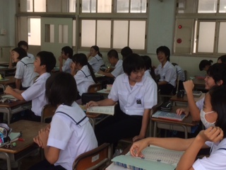 英語の1年生の授業です。Where do you play baseball?のクエッションにI play baseball in USJ.のアンサーにみんな爆笑しました。USAの間違ったかも・・