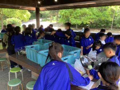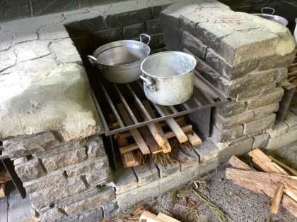 食器・用具を洗い、食材を切っています。かまども準備万端!でも、まだ火をつけたらダメ。