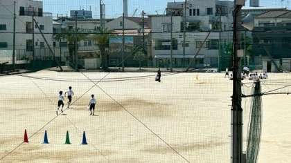 体力テスト、50m走のタイムを測定しています。ゴールまで全力疾走!!