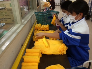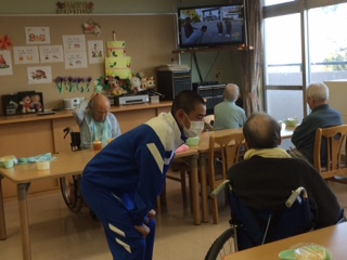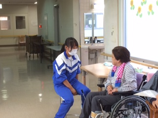 洗濯したタオルを水で濡らして巻いていく作業に黙々と取り組んだり、お年寄りのお遊びのお相手をさせていただいたり、話を聞いたりと頑張っています。