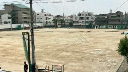 砂埃が立たないように運動場ににがりを撒く作業です。